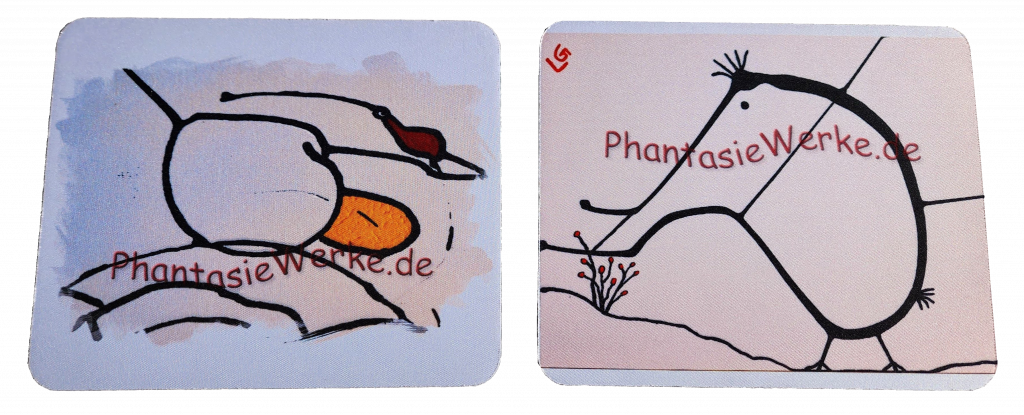 Beispielhaft je ein Mousepad mit dem Motiv Entenvogel + Ibis (links) sowie Maus-Vogel (rechts):